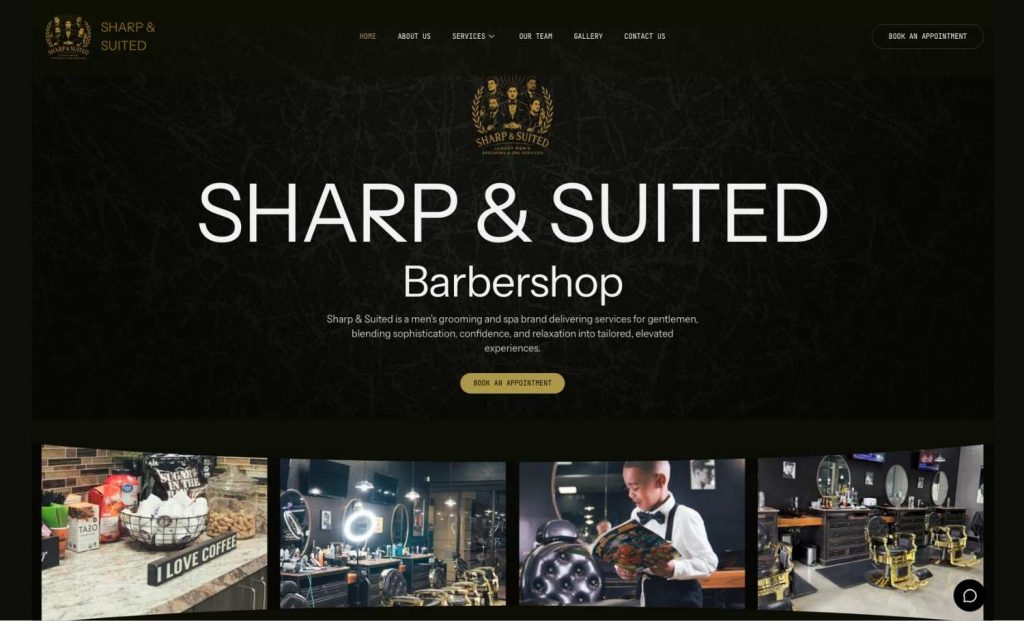 A sharp barbershop website featuring Booksy-powered bookings, integrated social feeds, service menus, and mobile-first UX designed to drive appointments and loyalty online.
